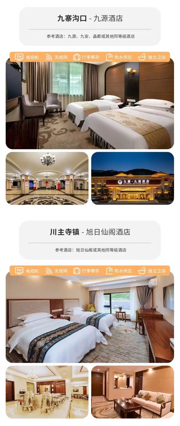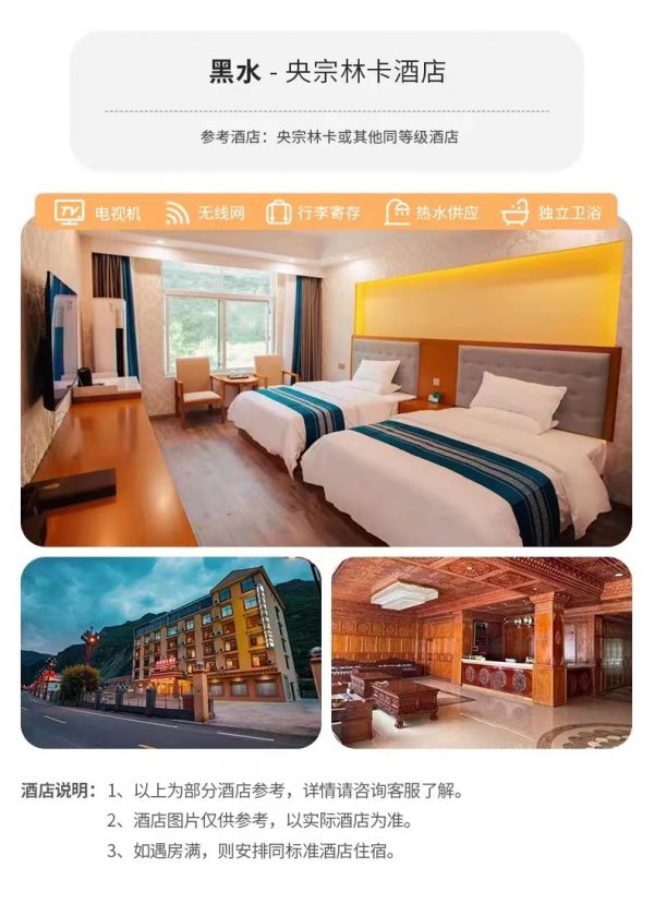 住宿:川主寺鎮(zhèn)酒店標(biāo)間說明”早餐后從黑水縣出發(fā),前往“人間瑤池”【黃龍風(fēng)景區(qū)】游覽(索道上行80元/人、下行40元/人,費(fèi)用自理,建議乘坐),這是一個(gè)以奇幻美麗的鈣化池聞名于世的景區(qū),景區(qū)內(nèi)眾多的鈣化池池水清澈見底,五光十色非常漂亮,還有森林、峽谷、雪山、瀑布等眾多的自然風(fēng)光,被稱為“人間瑤池”。以彩池、雪山、峽谷、森林“四絕”著稱于世,加上灘流、古寺、民俗稱為“七絕”。游覽后前往川主寺鎮(zhèn)入住。