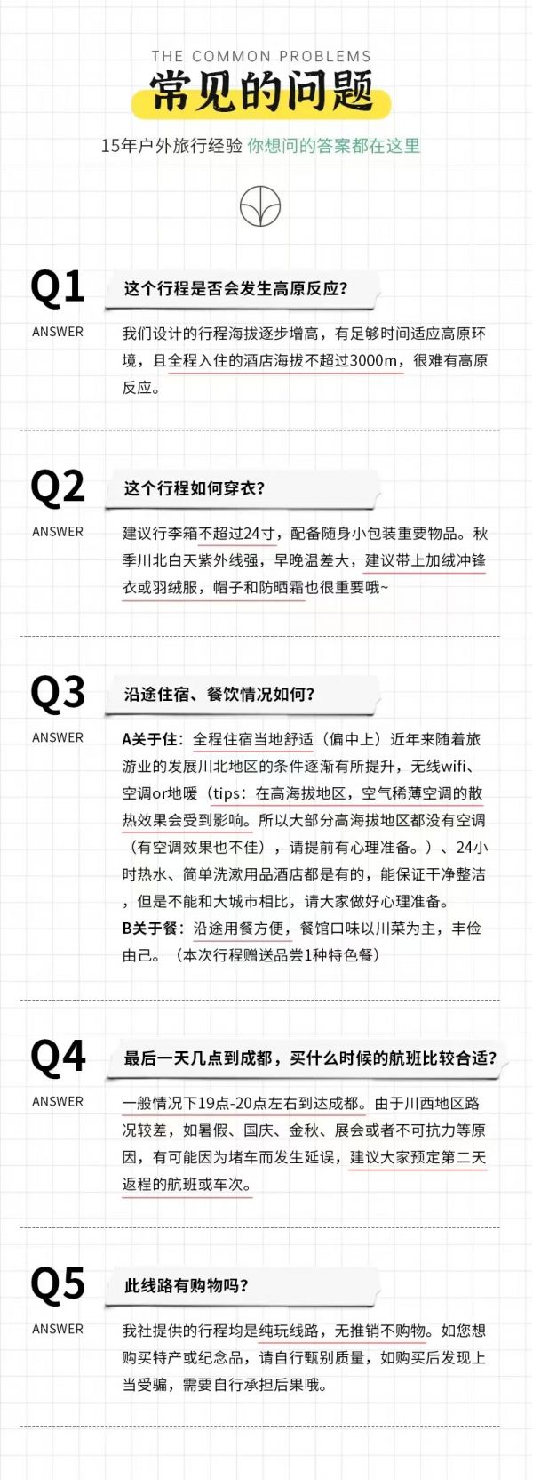 5、該線路為特種線路,當(dāng)?shù)鼐频昙安惋嫍l件無(wú)法與城市相比,請(qǐng)游客做好心理準(zhǔn)備;賓館內(nèi)無(wú)牙膏牙刷、拖鞋等一次性衛(wèi)生用品,請(qǐng)自備個(gè)人衛(wèi)生用品;沿途商店較少,民俗習(xí)慣亦有不同,游客可自備咸菜、小吃、干糧等零食,以備不時(shí)之需。
