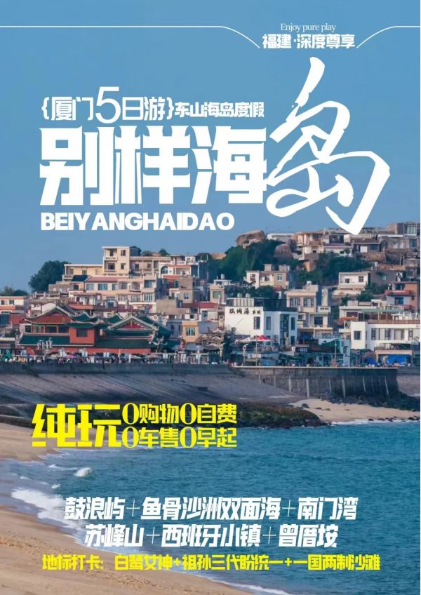廈門、夜宿鼓浪嶼、旅拍鼓浪嶼、東山島魚骨沙洲雙面海、西班牙卡達(dá)凱斯小鎮(zhèn)深度游雙飛五日(行程供參考,導(dǎo)游在不減少景點(diǎn)的情況下會(huì)根據(jù)實(shí)際情況相應(yīng)調(diào)整游覽順序)