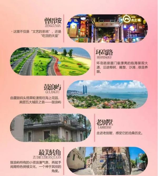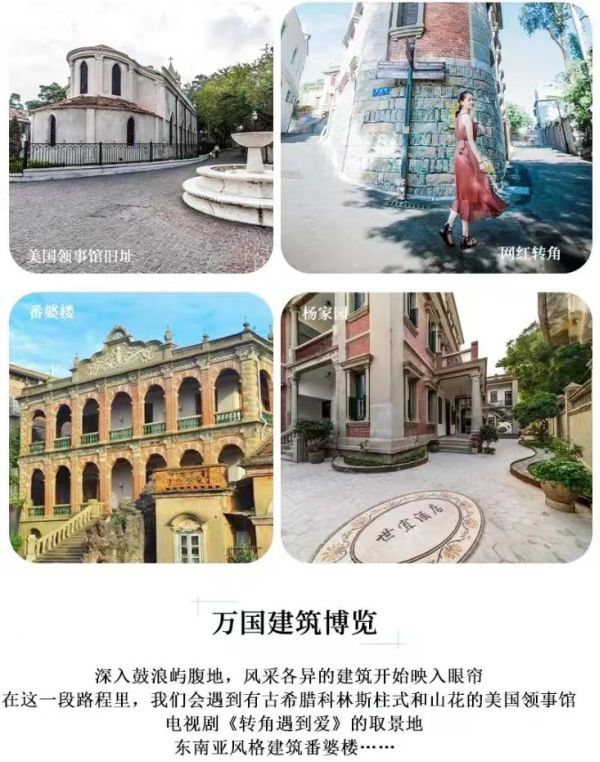 網(wǎng)紅打卡拍照點(diǎn):①「最美轉(zhuǎn)角」②「曉學(xué)堂·蟲洞書店」③「協(xié)和禮拜堂」④「天主教堂-萬(wàn)國(guó)領(lǐng)事館建筑博覽」⑤「怡園-林鶴年故居」