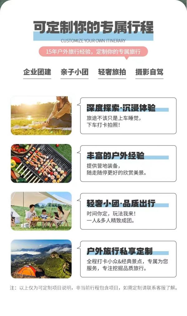 私人訂制:我們業(yè)務(wù)范圍囊括了全國(guó)各大城市,川西、西北、新疆、西藏,在路上永遠(yuǎn)有我們的身影。我們將為每一個(gè)有定制需求的你策劃出獨(dú)屬于自己的完美旅行。