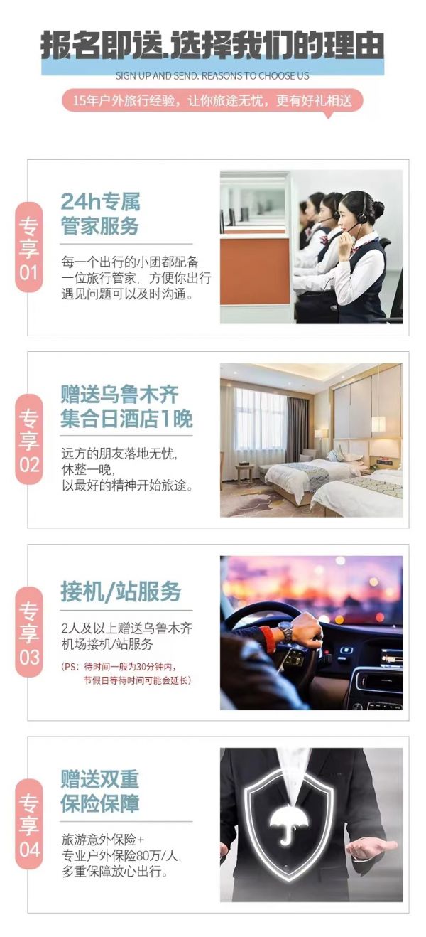 接站服務(wù):本次活動(dòng)提供烏魯木齊24小時(shí)接機(jī)/接站服務(wù),工作人員會(huì)在您出發(fā)日期前一天21:30之前向您推送消息并與您聯(lián)系,如果超過(guò)時(shí)間沒(méi)有接到任何通知,請(qǐng)及時(shí)與報(bào)名處聯(lián)系。(接站等待時(shí)間一般為15-20分鐘,最長(zhǎng)不超30分鐘,節(jié)假日拼單人數(shù)較多情況下客人等待時(shí)間可能會(huì)延長(zhǎng))。