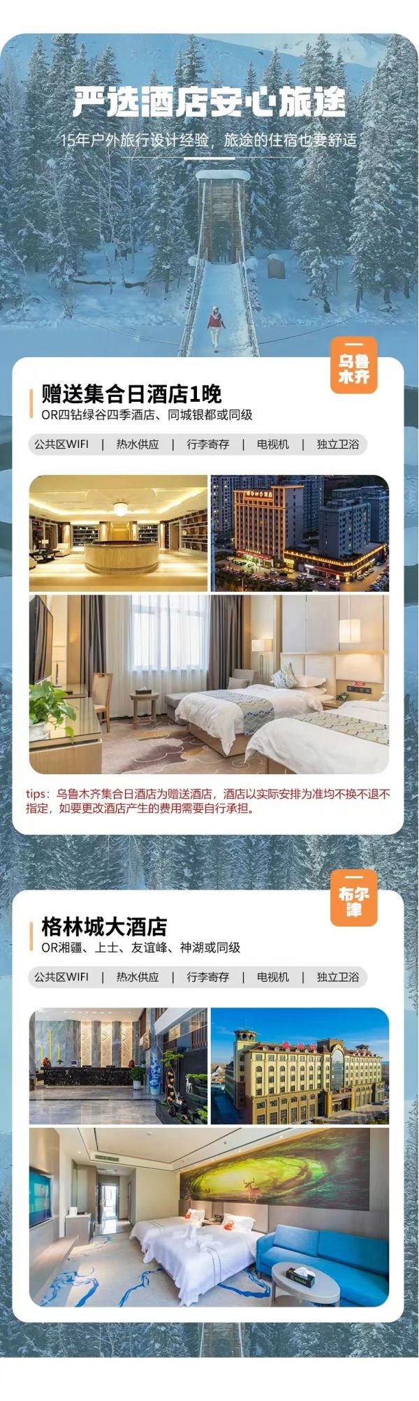 (4)對(duì)于住宿有特殊要求的隊(duì)員,請(qǐng)?jiān)趫?bào)名時(shí)告知客服(要求全程一個(gè)人住宿,大床房,三人間等等),在報(bào)名時(shí)確定費(fèi)用,上團(tuán)后臨時(shí)修改住宿,可能無(wú)法滿足其要求;
