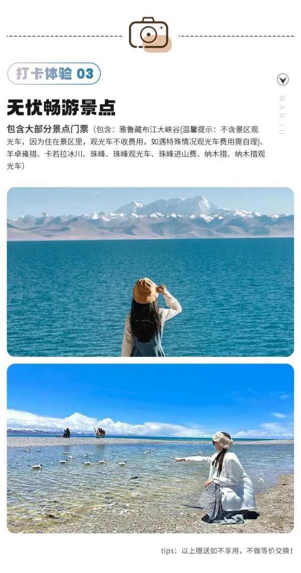 門票:包含雅魯藏布江大峽谷{溫馨提示:不含景區(qū)觀光車,因?yàn)樽≡诰皡^(qū)里,觀光車不收費(fèi)用,如遇特殊情況觀光車費(fèi)用需自理}、羊卓雍措、卡若拉冰川、珠峰大本營門票、珠峰觀光車、珠峰進(jìn)山費(fèi)、納木措、納木措觀光車。