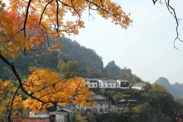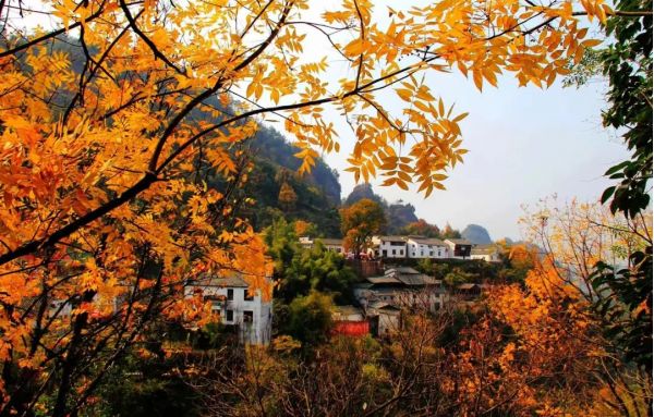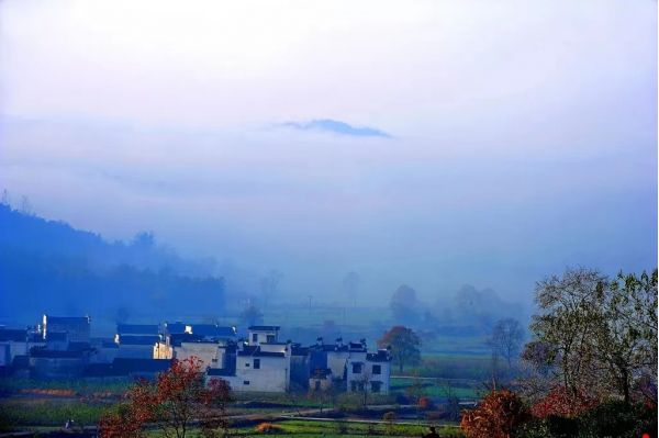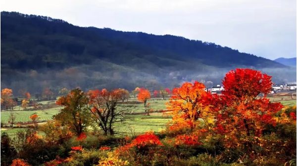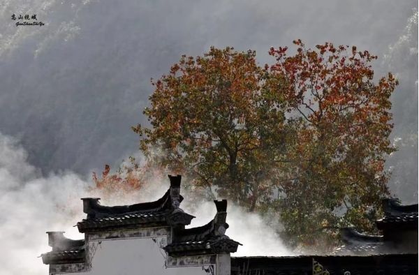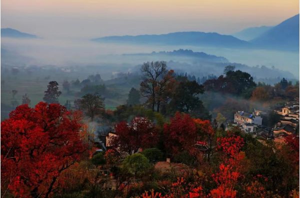 塔川烏桕樹經(jīng)過霜降,由綠變黃,由黃變紅,漸變出調(diào)色板般豐富的色彩。塔川的清晨極美,薄薄的霧氣似有似無,籠罩在山腰,林間,農(nóng)家的小屋若隱若現(xiàn),紅楓叢中小露飛檐翹角,黃葉微隙掩映粉墻黛瓦,如中國山水畫般詩情畫意。