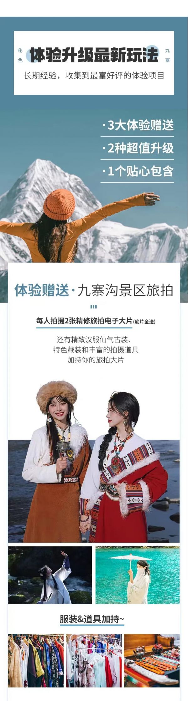 隨著季節(jié)的變化,九寨溝也呈現(xiàn)出不一樣的風(fēng)姿;深秋的九寨溝享譽世界,只見漸次經(jīng)霜的彩林深淺相間、錯落有致,是“萬山紅遍,層林盡染”的最佳寫照,在漫山遍野濃烈的紅襯托之下,碧水更綠、藍(lán)天更藍(lán),呈現(xiàn)出光怪陸離的水景;待入冬,莽莽林海都覆上皚皚白雪,林海雪原似玉樹瓊花,潔白、高雅,是觀賞九寨六絕之“藍(lán)冰”和“雪峰”的最好時機。也因這不二的美,這里也是許多熱門影視劇里的取景場地,今天我們就在這個大小熒屏收錄過的仙境來一場旅拍,由專業(yè)駐地攝影師為大家拍攝漢服/藏裝旅拍大片,每人2張精修電子照、底片全送,定格住旅程最美的瞬間。