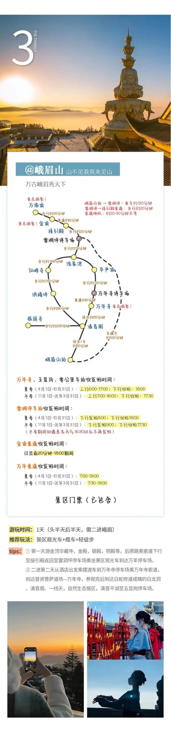 【金頂】,游金頂華藏寺,金殿,銀殿,銅殿,大型觀景臺等,觀世界最高佛教朝拜中心,登攝身崖,俯視川西平原的優(yōu)美風(fēng)光,充分感受峨眉“雄,秀,奇,險,幽”的五大特色。然后原路乘索道下行至接引殿返回至雷洞坪停車場乘坐景區(qū)觀光車到達(dá)萬年停車場。