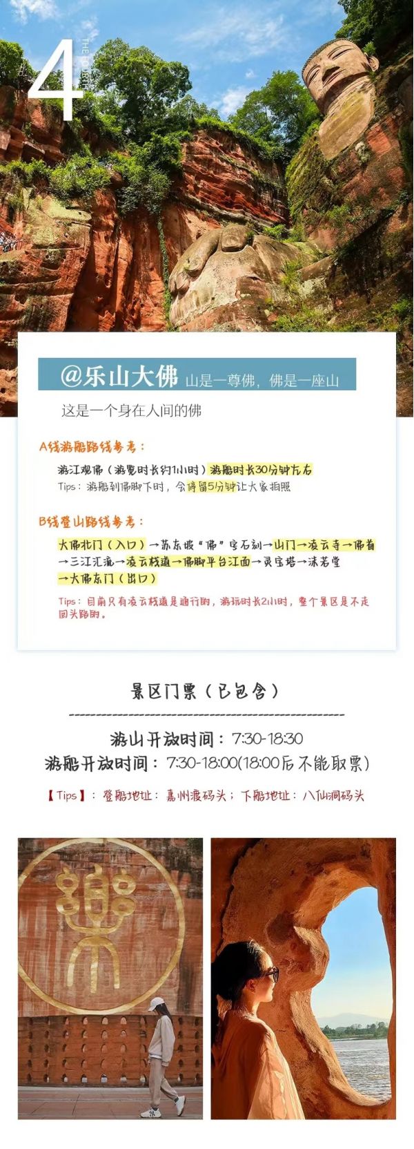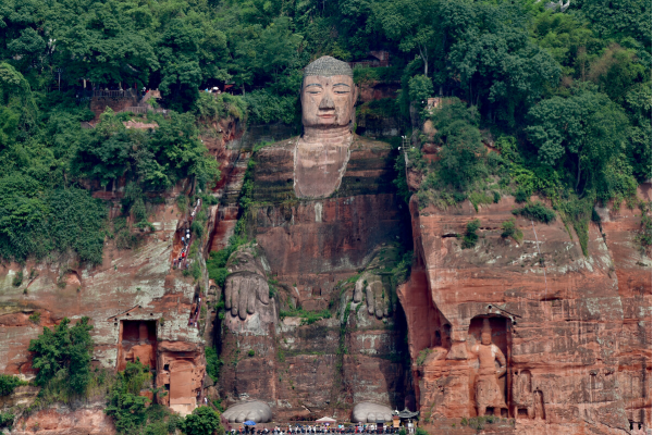 用午餐,品嘗世界非物質(zhì)文化遺產(chǎn)-翹腳牛肉或峨眉地道九大碗(根據(jù)實際情況2選1安排),步行約15分鐘至迎春橋,乘坐旅游車來到樂山。深度登山游覽樂山大佛景區(qū)(參觀約3小時)步行333個臺階到達(dá)山頂,觀賞世界第一大彌勒坐佛-樂山大佛、凌云寺、九曲摘道、大雄寶殿、靈寶塔,在瞻仰樂山大佛宏偉氣勢的同時,體驗”蜀道難、難于上青天的感覺”,抱千年佛腳后,游漫山的石刻佛像、凌云寺、靈寶塔從東門下山返回到停車場。也可以選擇樂山大佛游船活動哦~看樂山大佛湖面全景。