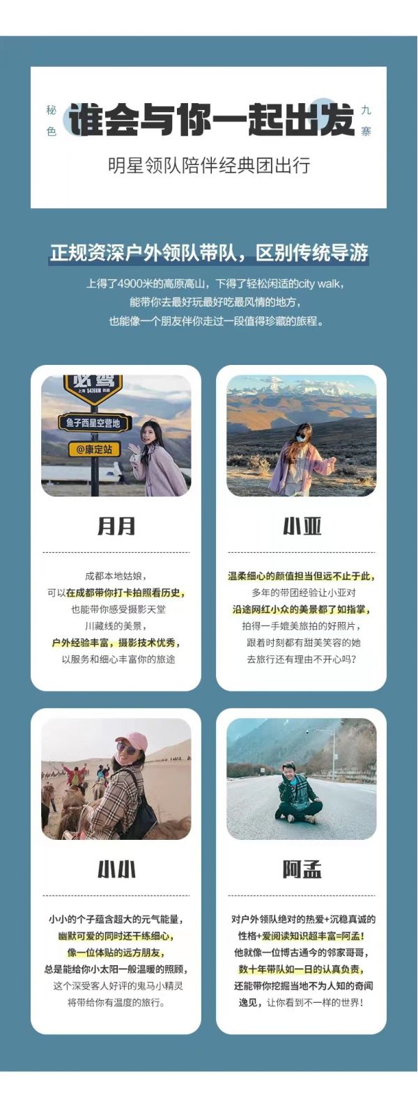 3. 建議隊員們在集合日抵達(dá)成都后,可在市區(qū)采購一些旅行用品,如零食、佐餐小菜、藥品等;