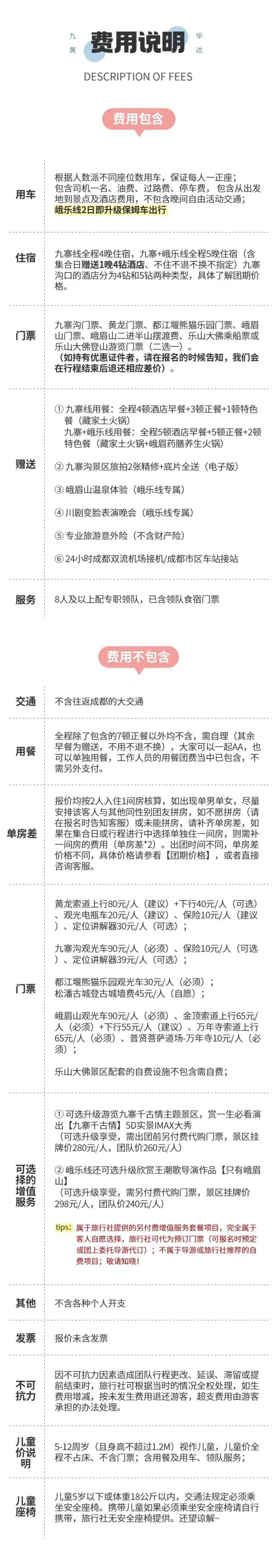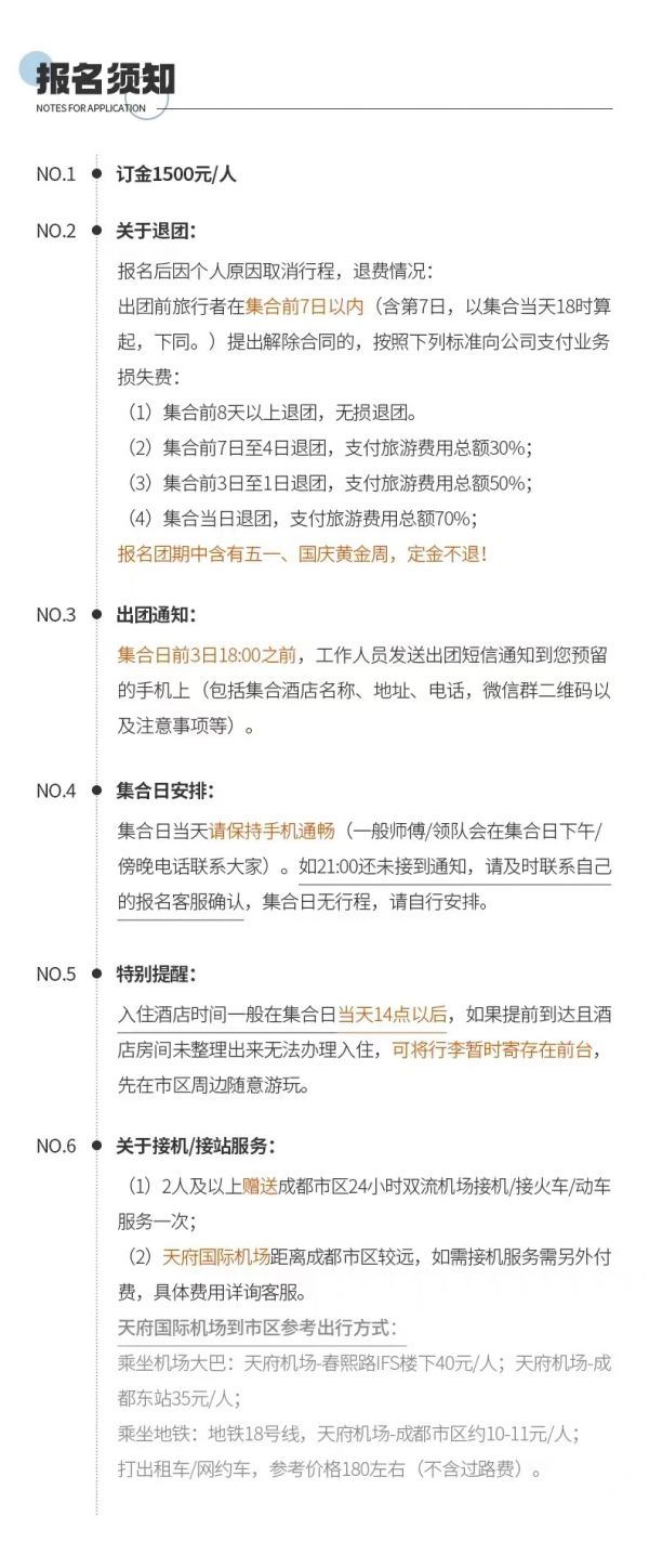 3、當(dāng)天返回成都時間約在下午的21:30左右,由于不能預(yù)估有可能堵車等不可抗力因素情況,建議客人不要預(yù)定當(dāng)天返程的火車或是飛機,以免因為堵車給您帶來沒有必要的損失。若因自行預(yù)定當(dāng)天大交通造成延誤的,我社不賠償任何費用,不承擔(dān)任何責(zé)任!敬請知曉。