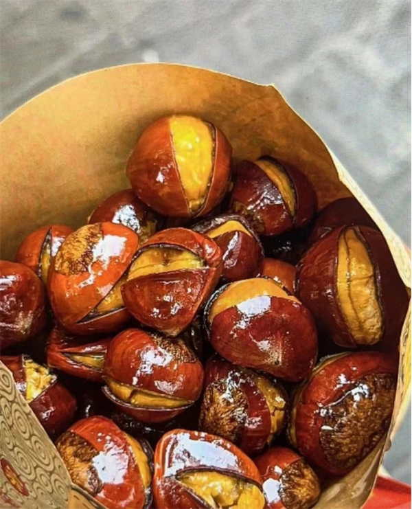 最近沒事在街上溜達的時候,頻頻被她吸引目光。是的沒錯,一鍋鍋褐色板栗總是在有意無意地散發(fā)香味,剛出鍋的糖炒栗子渾身散發(fā)著溫暖的熱氣,油潤的外殼直冒焦香,連口中呼出的熱氣都帶著栗子的香氣。