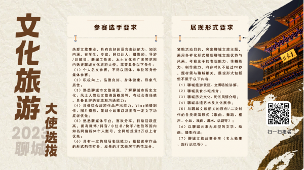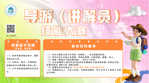 為深入貫徹落實(shí)省委、省政府《關(guān)于促進(jìn)文旅深度融合推動旅游業(yè)高質(zhì)量發(fā)展的意見》,圍繞“文旅興市”目標(biāo)任務(wù),塑強(qiáng)聊城“兩河之約”文旅品牌,提升“江北水城·兩河明珠”城市品牌影響力和吸引力,助力建設(shè)青年友好型城市。聊城市啟動“兩河之約·最聊城”2023聊城文化旅游大使選拔暨導(dǎo)游(講解員)職業(yè)技能大賽,2023年12月9日前,均可通過線上報名通道報名參賽。