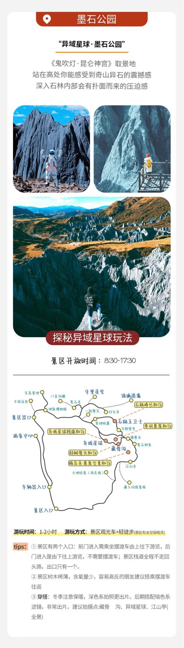 門票:畢棚溝觀光車60元/人、電瓶車20-30元/人(上下4段,分段計(jì)費(fèi),建議乘坐);墨石公園觀光車20元/人;