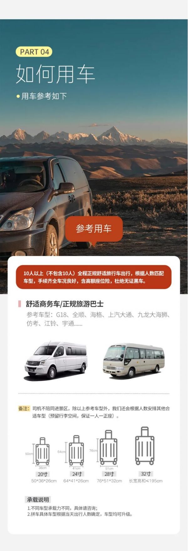 用車:車型根據(jù)人數(shù)決定,保證每人一正座;包含司機(jī)一名、油費(fèi)、過路費(fèi)、停車費(fèi),包含從出發(fā)地到景點(diǎn)及酒店費(fèi)用,不包含晚間自由活動(dòng)交通;