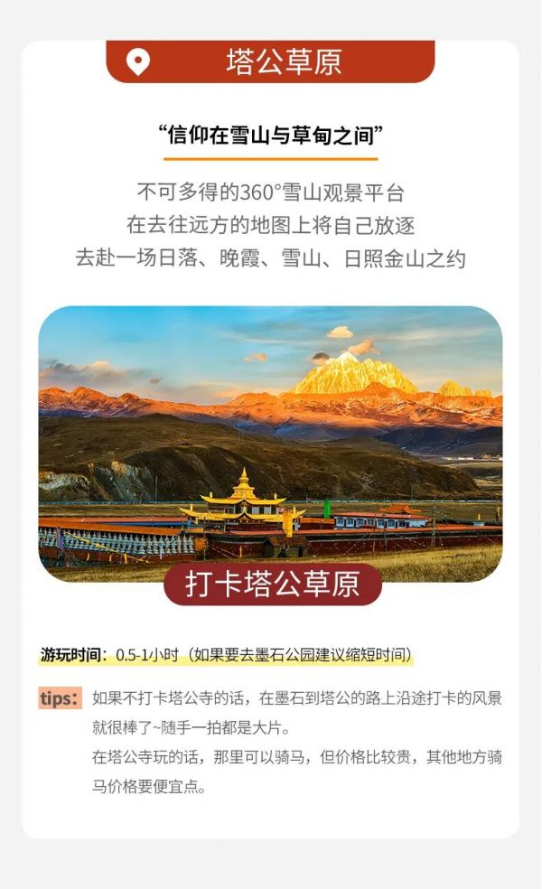? 【塔公草原】這是一處令人驚喜的取景地,塔公沿路野花盡享盛放,綠茵茵的草地上偶爾有白底藍(lán)色圖案的賬蓬隨意地支著,可能還會(huì)有牦牛、馬或羊等悠閑吃草的身影闖進(jìn)視野里,你的心情也會(huì)變得明朗而隨意起來,游覽時(shí)間約1H。