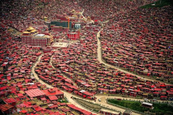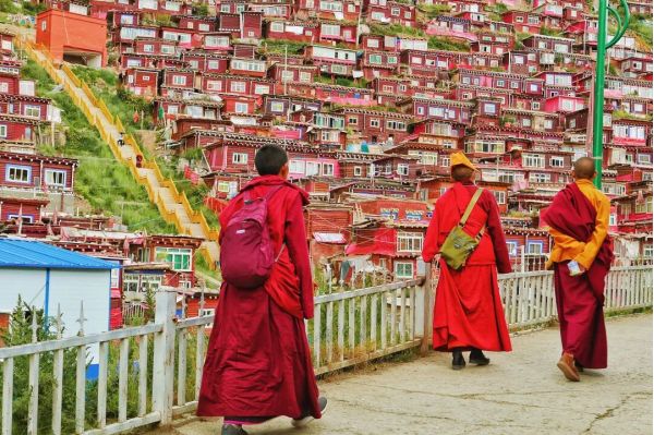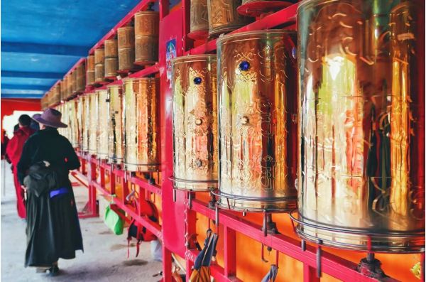 ? 震撼的佛國(guó)畫卷逐漸展開--入目處盡是朱紅的佛色,裹著紅袍的僧人在其間穿行,空氣里彌漫著佛香。在金紅相間的佛學(xué)院漫步,學(xué)著僧人面目虔誠(chéng)地轉(zhuǎn)經(jīng)、朝拜,在觸動(dòng)轉(zhuǎn)經(jīng)筒的旋轉(zhuǎn)中,感受“信仰”的具象化。