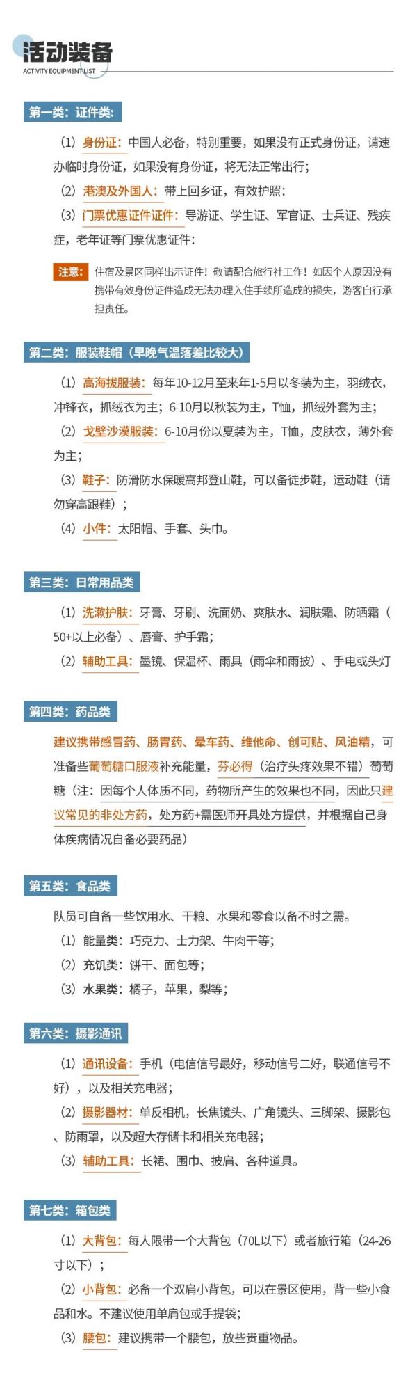 3. 建議隊(duì)員們?cè)诩先盏诌_(dá)成都后,可在市區(qū)采購(gòu)一些旅行用品,如零食、佐餐小菜、藥品等;