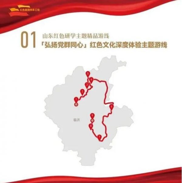 1. 臨沂市費(fèi)縣大青山勝利突圍紀(jì)念館——2.臨沂市蒙陰孟良崮旅游區(qū)——3.臨沂市沂南山東紅嫂家鄉(xiāng)旅游區(qū)——4.臨沂市沂水桃棵子旅游區(qū)——5.臨沂市沂水中共中央山東分局舊址——6.臨沂市莒南山東省政府舊址暨八路軍115師司令部舊址——7.臨沂市臨沭紅色朱村——8.臨沂市蘭山華東革命烈士陵園——9.臨沂市河?xùn)|華東野戰(zhàn)軍總部暨新四軍軍部舊址