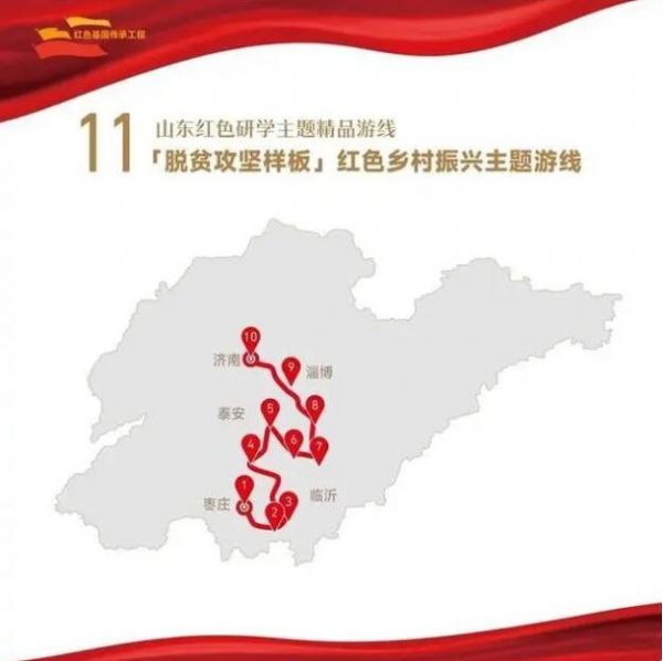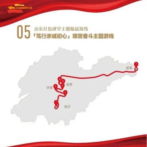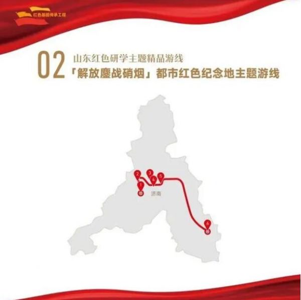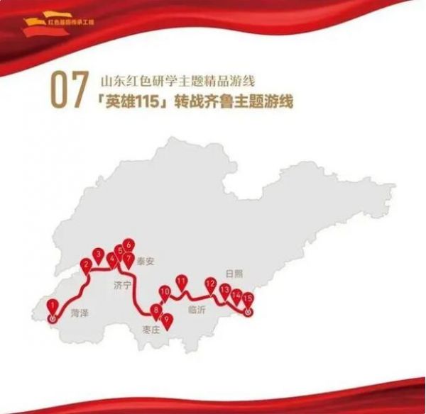 1. 菏澤市湖西人民會(huì)議廳舊址——2.濟(jì)寧市翟莊黨支部舊址——3.棗莊市滕州微山湖紅荷濕地景區(qū)——4.棗莊市津浦鐵路臨城站舊址——5.濟(jì)寧市微山湖旅游區(qū)——6.濟(jì)寧市微山縣劉少奇過(guò)湖處遺址——7.煙臺(tái)市招遠(yuǎn)羅山黃金生態(tài)旅游區(qū)
