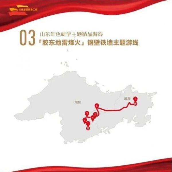 1. 煙臺(tái)市地雷戰(zhàn)旅游景區(qū)——2.煙臺(tái)市海陽(yáng)地雷戰(zhàn)紀(jì)念館——3.煙臺(tái)市八路軍膠東軍區(qū)機(jī)關(guān)舊址——4.威海市馬石山烈士陵園——5.威海市紅色密營(yíng)(下石硼村)——6.威海市膠東育兒所——7.威海市文登天福山革命遺址