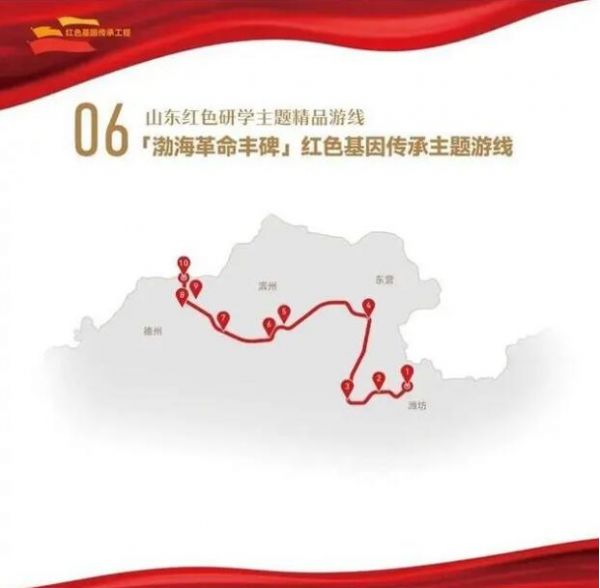 1. 濰坊市大家洼紅色革命研學(xué)基地——2.濰坊市壽光牛頭鎮(zhèn)抗日武裝起義陳列館——3.東營(yíng)市紅色劉集旅游景區(qū)——4.東營(yíng)市渤海墾區(qū)革命紀(jì)念館——5.濱州市渤海革命老區(qū)紀(jì)念園——6.濱州市渤海革命老區(qū)機(jī)關(guān)舊址——7.濱州市渤海革命老區(qū)兵器博物館——8.德州市冀魯邊區(qū)革命紀(jì)念園——9.德州市八路軍冀魯邊區(qū)抗戰(zhàn)郵局舊址——10.德州市北海銀行冀魯邊區(qū)分行舊址