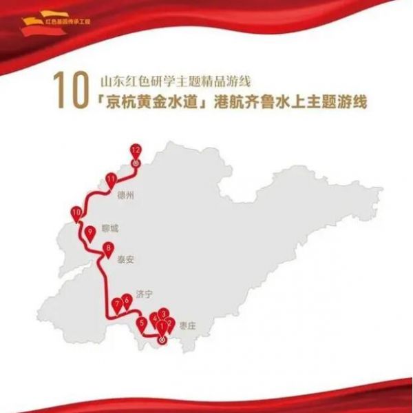 1. 棗莊市臺(tái)兒莊古運(yùn)河——2.棗莊市臺(tái)兒莊古城——3.棗莊市臺(tái)兒莊大戰(zhàn)紀(jì)念館——4.棗莊市臺(tái)兒莊運(yùn)河國(guó)家濕地公園——5.濟(jì)寧市微山湖旅游區(qū)——6.棗莊市微山湖紅荷濕地景區(qū)——7.濟(jì)寧市微山湖南陽(yáng)古鎮(zhèn)——8.泰安市東平湖旅游區(qū)——9.聊城市孔繁森同志紀(jì)念館——10.聊城市臨清運(yùn)河鈔關(guān)——11.德州市普利森機(jī)床博物館——12.德州市樂(lè)陵大桑樹村