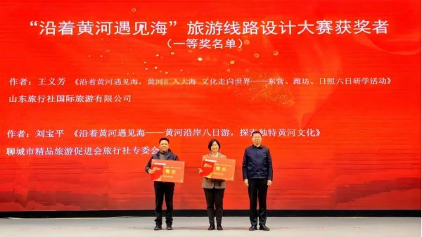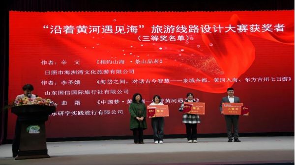 會上,對山東省“沿著黃河遇見?!甭糜尉€路產(chǎn)品設(shè)計(jì)大賽獲獎?wù)哂枰宰C書和現(xiàn)金獎勵。