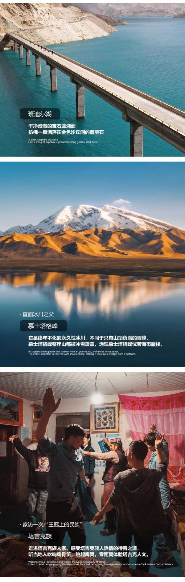 告別“東方摩洛哥”—喀什,我們將開啟一段帕米爾高原之旅。沿314國道一路暢游帕米爾高原風(fēng)光,首先驚艷我們的是背靠白色沙丘和雪山的【白沙湖】,在陽光的變化下,湖水時(shí)而呈湛藍(lán)色,時(shí)而呈綠色。更令人驚嘆的是,藍(lán)色的湖面與白沙相接,一半藍(lán)一半白,而白沙背后還有雪山。在雪山和白沙的映襯之下,白沙湖水更顯澄澈。在這里能get湖泊、白沙、雪山同框的畫面。分享一個(gè)冷知識(shí):白沙湖又名流沙河,就是西游記里唐僧收服沙和尚的地方。我們還能途觀慕士塔格峰,山頂常年皚皚白雪,猶如滿頭白發(fā),十余條冰川鑲嵌在峰體下的峽谷中,如胸前飄動(dòng)的銀須,故有“冰山之父”的美稱。隨后我們將遇見【卡拉庫里湖】,這里能看到雪山倒映在湖面的風(fēng)景,拍出來的照片特別的給人純凈的感覺。