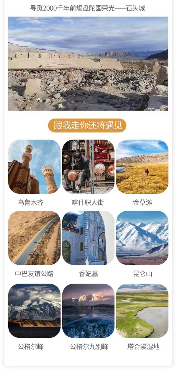 酒店早餐后,后乘車前往瓦恰鄉(xiāng),沿塔莎古道進(jìn)入昆侖山腹地,據(jù)說這是高僧玄奘取經(jīng)回歸大唐所經(jīng)之路。我們會(huì)途經(jīng)【班迪爾湖】,它像是一串灑落在金色沙丘間的藍(lán)寶石。接著經(jīng)過【坎爾洋村】,歌曲《花兒為什么這樣紅》的發(fā)源地,塔吉克新娘油畫創(chuàng)作地,無數(shù)畫家、攝影師向往的采風(fēng)地。