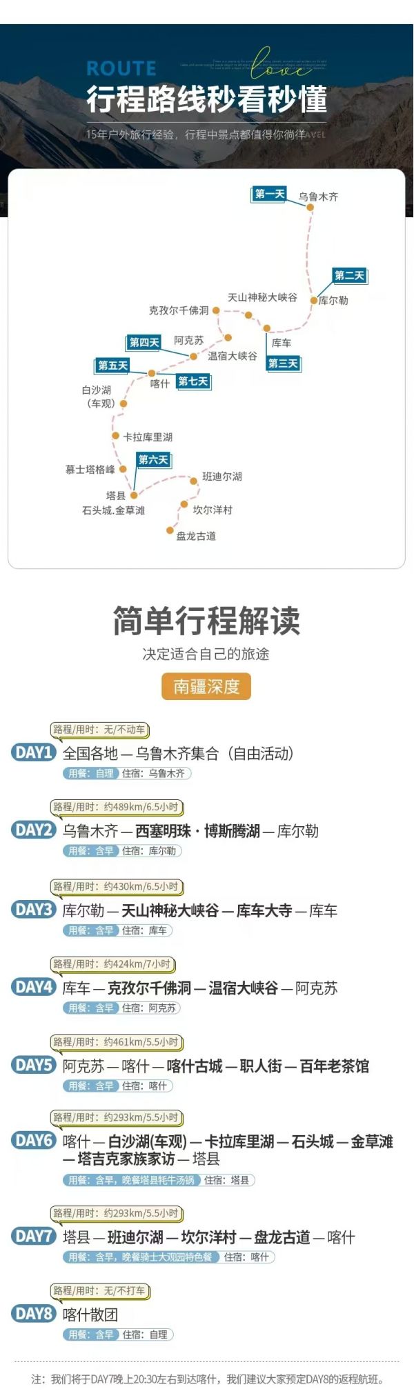 當(dāng)天車程較長,從北疆穿越天山甘溝進(jìn)入南疆腹地,氣候變化較大,請適當(dāng)增減衣物,注意補(bǔ)充水分??商崆百徺I一些零食,以備不時(shí)之需。