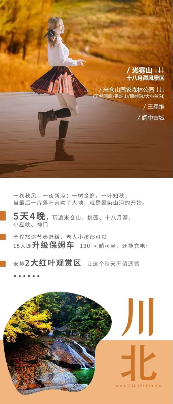 早餐后出發(fā),經(jīng)成巴高速抵達位于川東北的巴中【光霧山】,光霧山被譽為“中國紅葉第一山”,因常年云霧繚繞而得名,每年10月~11月是觀賞光霧山紅葉的最佳時機?!臼嗽绿丁渴遣卦诠忪F山深處的動人篇章,曾有人說:十八月潭是川東北的“九寨溝”,瀑布似九寨,紅葉絕天下。在長約3.5公里的珍珠溝內(nèi),密布著18個恍若神造仙成的瀑潭,每個潭形似月桂,基本上有一相映的瀑布,謂之“十八月潭”。大小水潭似顆顆珍珠綴成的長長珠鏈,沿溝飛瀉的瀑流如粒粒珍珠鋪就的幅幅珠簾。漫步其間,潭水相連,時而穿過大片彩林,一瀉千里,時而一片靜謐,明凈幽藍。登高俯瞰,滿目流金瀉玉、彩虹波動,尤如串串珍珠藏于溝壑溪澗。步入十八月潭,如在畫中游,讓你陶醉得駐足不前??催^秋景后前往光霧山鎮(zhèn)入住。