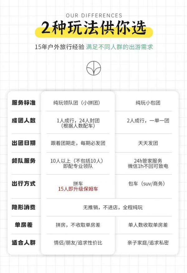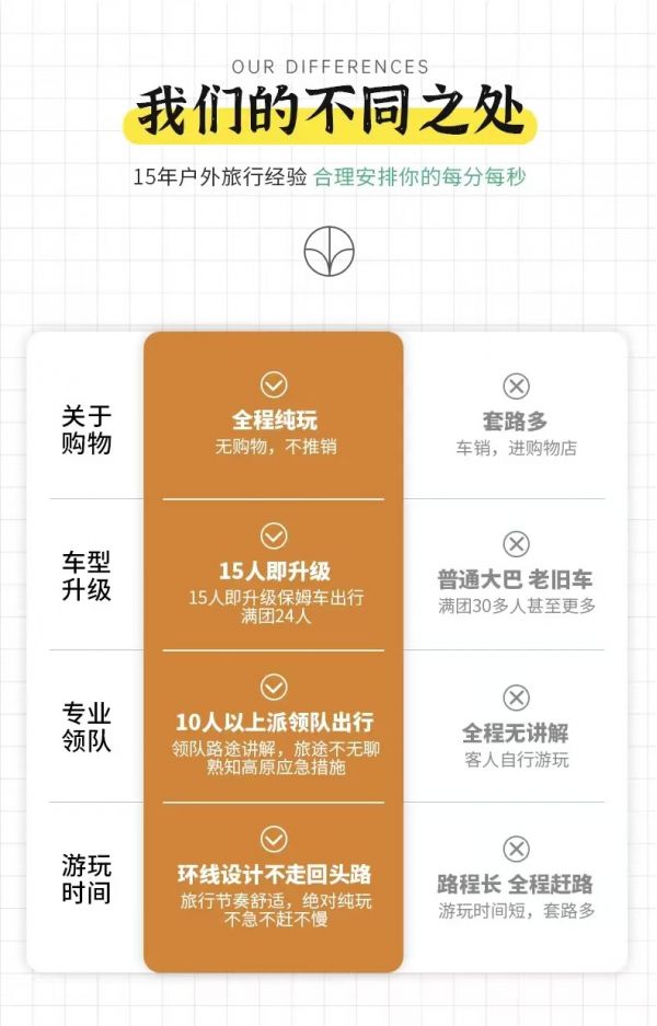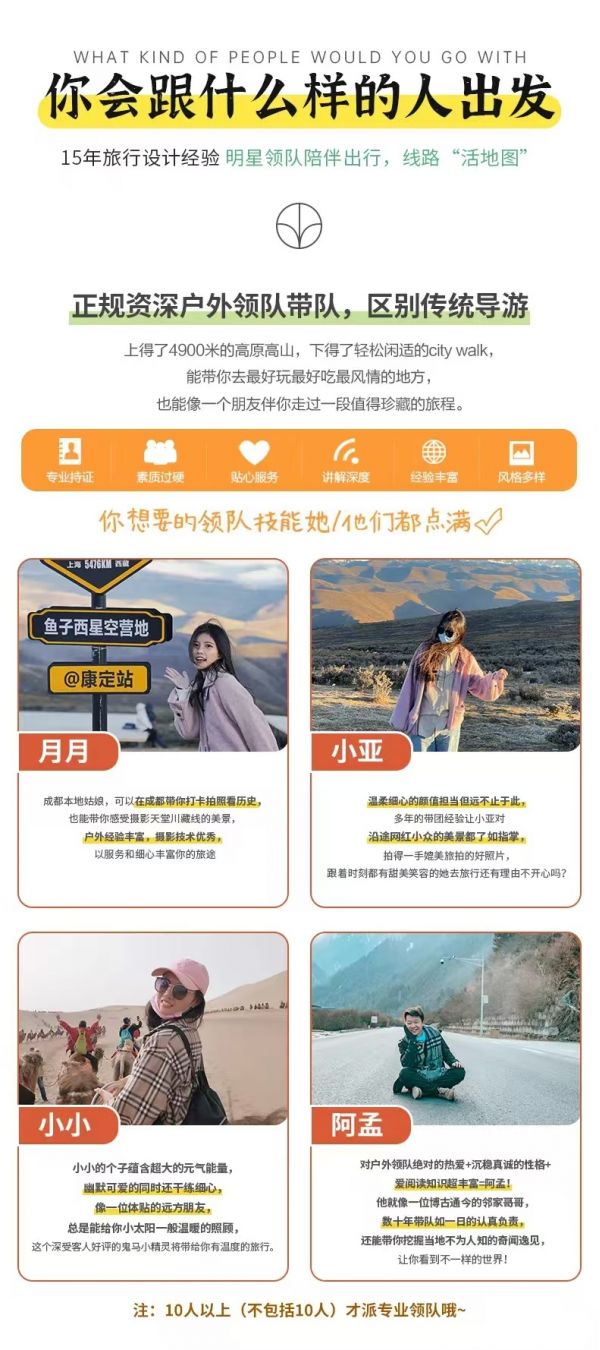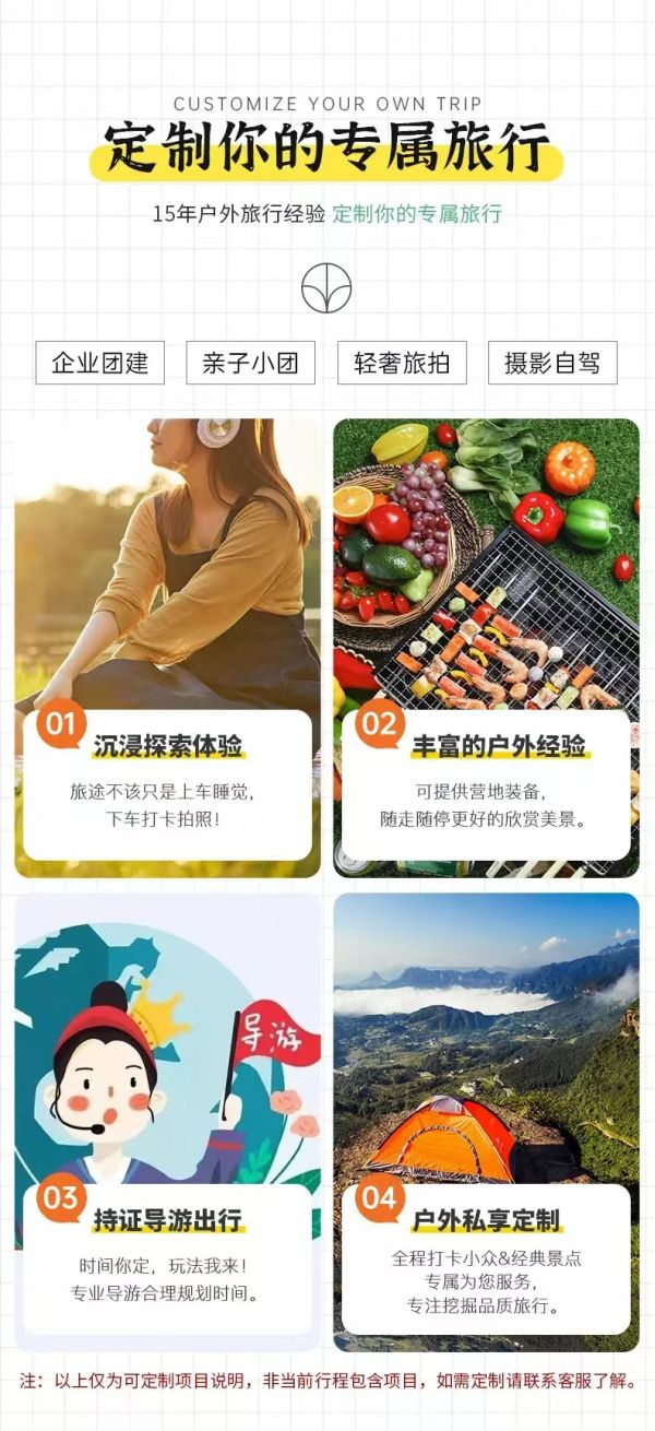 私人訂制:我們業(yè)務(wù)范圍囊括了全國各大城市,川西、西北、新疆,在路上永遠有我們的身影。我們將為每一個有定制需求的你策劃出獨屬于自己的完美旅行。