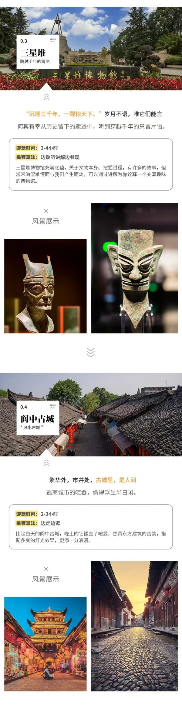 早晨從成都酒店出發(fā),大家相互認識,相互熟悉,一路歡歌笑語,充滿期待。隨后抵達【三星堆博物館】開始參觀,三星堆古遺址距今已有3000至5000年歷史,是迄今在西南地區(qū)發(fā)現(xiàn)的范圍最大、延續(xù)時間最長、文化內(nèi)涵最豐富的古城、古國、古蜀文化遺址。在這批古蜀秘寶中,有許多光怪陸離奇異詭譎的青銅造型,有高2.62米的【青銅大立人】、有寬1.38米的【青銅面具】、更有高達3.95米的【青銅神樹】等,均堪稱獨一無二的曠世神品。而以流光溢彩的金杖為代表的金器,以滿飾圖案的邊璋為代表的玉石器,亦多屬前所未見的稀世之珍。游覽后繼續(xù)出發(fā),下午抵達【閬中古城】,古城山圍四面,水繞三方,有著2300多年的歷史,與安徽黃山的徽州古城、山西平遙的平遙古城和云南麗江的麗江古城并稱為中國四大古城,如果說麗江古城是風(fēng)花雪月,那么閬中古城便是人間煙火,古城里時不時飄出的陣陣醋香更是久久縈繞在心頭,古城所蘊含的三國文化、春節(jié)文化、科舉文化更是值得深入探究。晚上我們?nèi)胱」懦侵苓叄绕鸢滋斓拈佒泄懦?,晚上的它褪去了喧囂,更具東方建筑的古韻,搭配多變的燈光效果,更添一分浪漫。