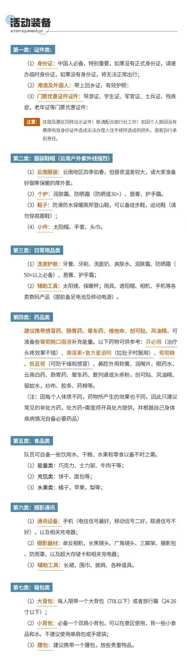 3. 建議隊(duì)員們?cè)诩先盏诌_(dá)昆明后,可在市區(qū)采購(gòu)一些旅行用品,如零食、佐餐小菜、藥品等;