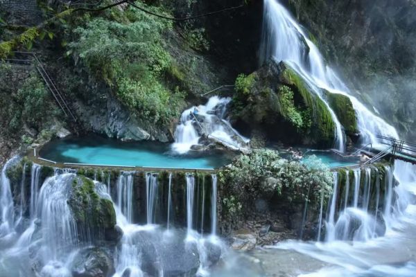 螺髻山九十九里溫泉不僅是世界第一大溫泉瀑布,還是世界唯一的掛壁溫泉、世界唯一的溫泉群島,由數(shù)十個(gè)大小不一的溫泉瀑布組合而成的一個(gè)寬達(dá)200余米的溫泉瀑布群。首先映入眼簾的是一泓清澈見底的大槽河,河流纏繞在青山綠水間,漫步在奔騰而下的大槽河畔,陣陣涼風(fēng)夾雜著水霧撲面而來(lái),郁郁蔥蔥的山嶺上百瀑飛瀉,雄奇的靈崖異石,成群的瀑布形態(tài)各異;順著河流而上,聲響如雷,一簾高31米寬19米掛在懸崖峭壁之上的溫泉瀑布呈現(xiàn)在了眼前,銀簾空懸而掛,蒸騰彌漫、熱霧繚繞;崖壁上的天然小水池,被稱之為“鴛鴦池”,沐浴其間,聽滴水彈琴,享靈崖泉韻,觀簾外景物,撲塑迷離,恍若大虛幻景。