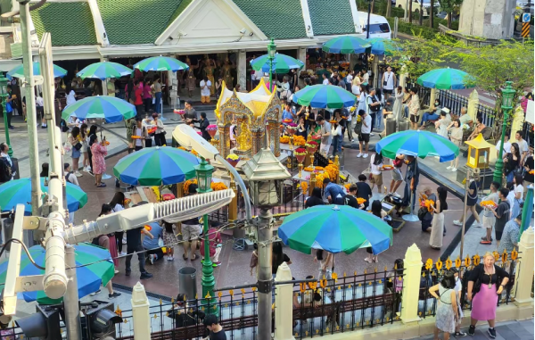 前往【皇家寺】,寺中供奉著佛像可供游客為家人祈福,我們先去拜泰國(guó)的四面佛。 四面佛的四面順時(shí)針?lè)较虻谝幻媲笃桨?、第二面求事業(yè)、第三面求愛(ài)情婚姻、第四面求金錢。燒一套香燭,插一小束花在佛前,據(jù)說(shuō)是很靈的。