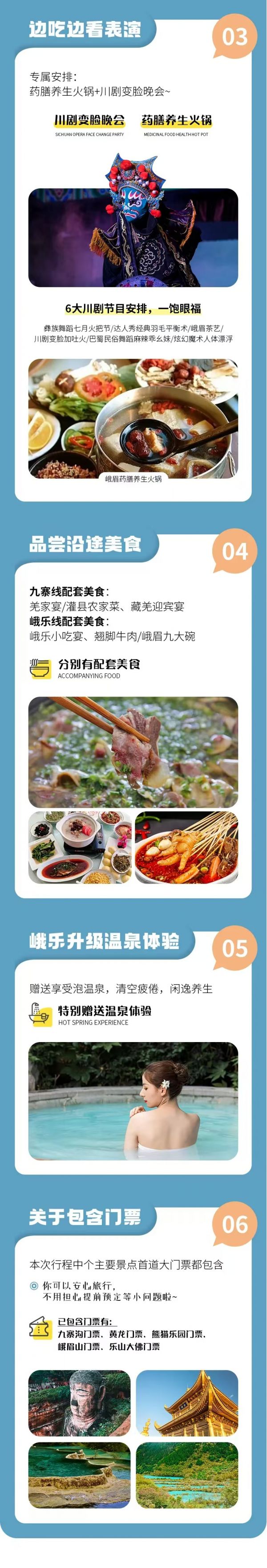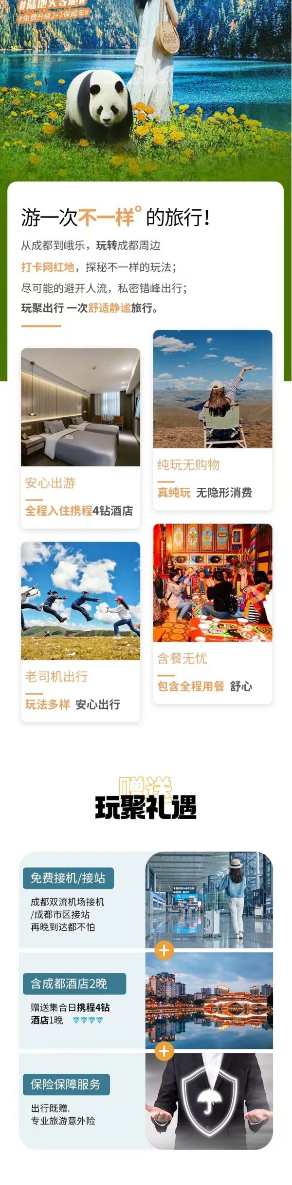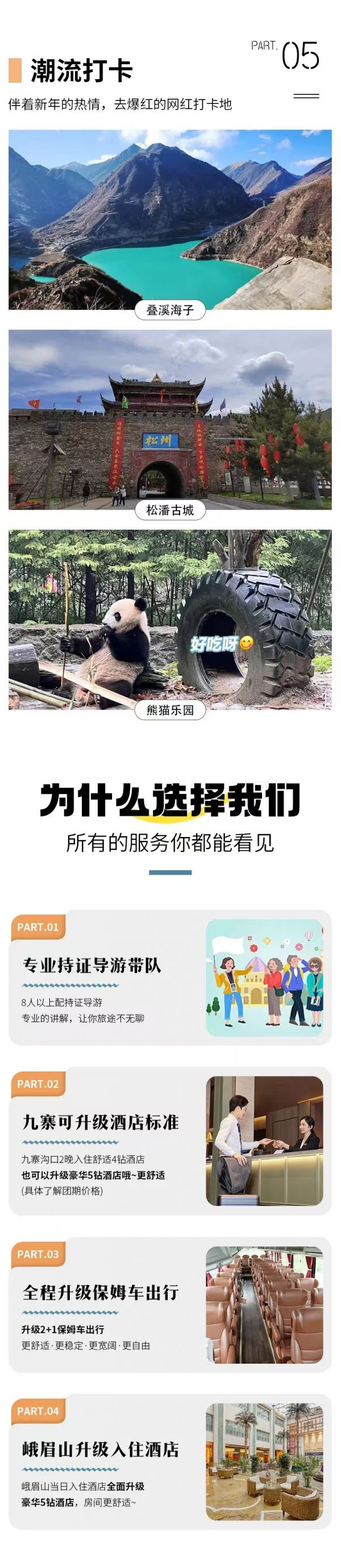 贈送:九寨溝景區(qū)旅拍2張精修+底片全送(電子版)、峨眉山溫泉體驗(yàn)、川劇變臉表演晚會、專業(yè)旅游意外險(不含財產(chǎn)險)、2人以上24H成都雙流機(jī)場接機(jī)/成都市區(qū)車站接站