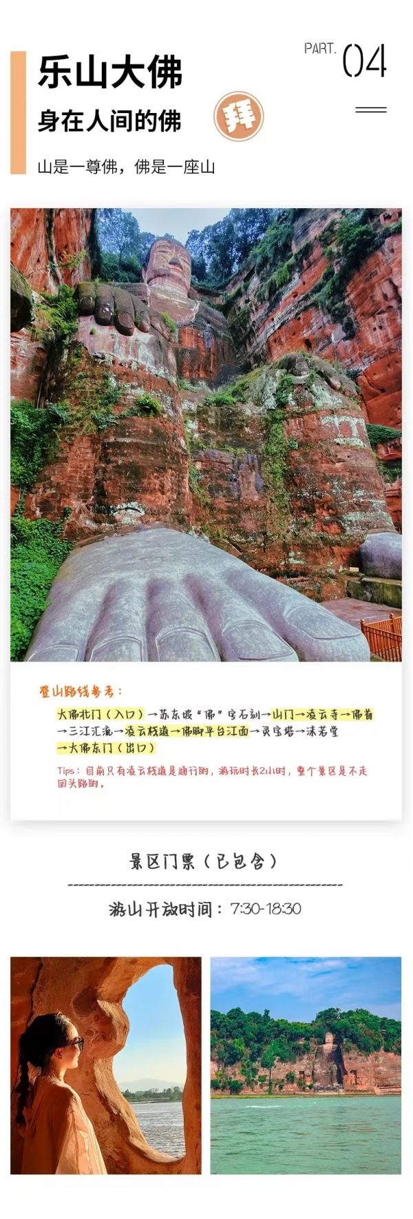 用午餐,品嘗世界非物質(zhì)文化遺產(chǎn)-翹腳牛肉或峨眉地道九大碗(根據(jù)實(shí)際情況2選1安排),步行約15分鐘至迎春橋,乘坐旅游車來到樂山。深度登山游覽樂山大佛景區(qū)(參觀約3小時)步行333個臺階到達(dá)山頂,觀賞世界第一大彌勒坐佛-樂山大佛、凌云寺、九曲摘道、大雄寶殿、靈寶塔,在瞻仰樂山大佛宏偉氣勢的同時,體驗(yàn)”蜀道難、難于上青天的感覺”,抱千年佛腳后,游漫山的石刻佛像、凌云寺、靈寶塔從東門下山返回到停車場。