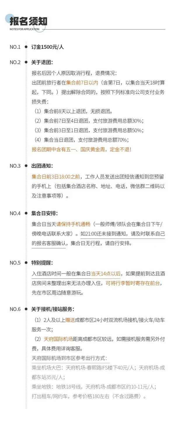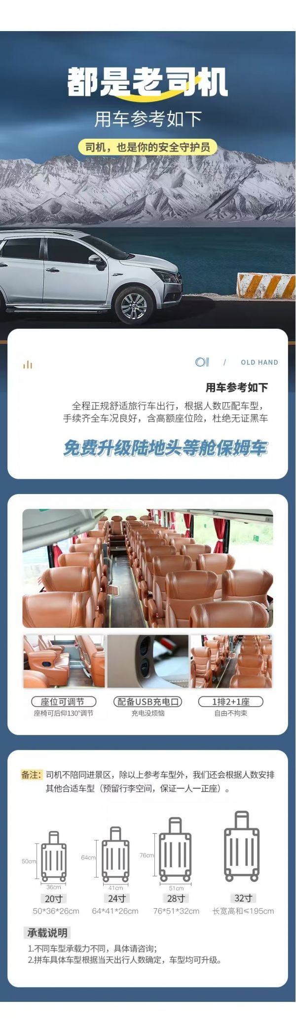 注意事項:出發(fā)前一天晚上18:00-22:30通知接你的具體時間,請務(wù)必保持電話暢通(接早的時間根據(jù)師傅線路決定,為保障整個團(tuán)隊的順利出行請注意配合時間安排,感謝理解)