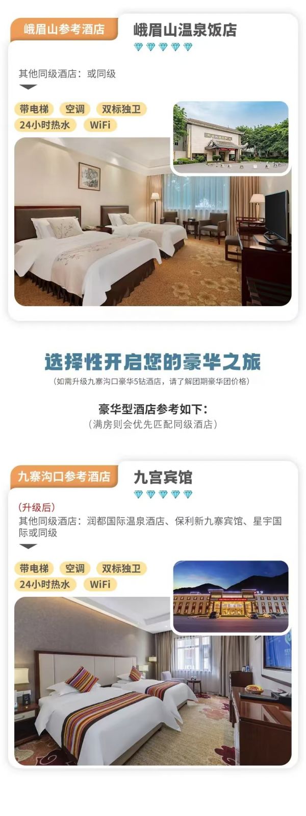 住宿:全程5晚住宿(含集合日贈送1晚4鉆酒店、不住不退不換不指定)九寨溝口的酒店分為4鉆和5鉆兩種類型,具體了解團(tuán)期價格。