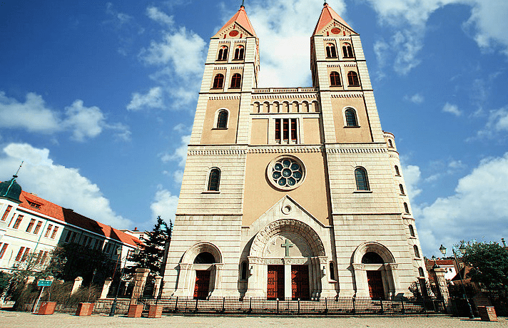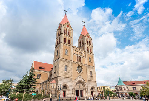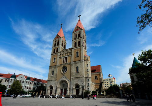 早7:00集合出發(fā),預(yù)計(jì)12:00到達(dá)青島天主教堂。后自由游覽,預(yù)計(jì)時(shí)間1小時(shí)。教堂以黃色花青島天主教堂崗巖和鋼筋混凝土砌成,表面雕以簡(jiǎn)潔優(yōu)美的紋案。窗戶(hù)為半圓拱形,線(xiàn)條流暢,顯得莊重而樸素。大門(mén)上方設(shè)一巨大玫瑰窗,兩側(cè)各聳立一座鐘塔,塔身高56米,紅瓦覆蓋的錐形塔尖上各豎立一個(gè)4.5米高的巨大十字架,塔內(nèi)懸有四口大鐘,一旦鐘樂(lè)鳴奏,聲傳數(shù)里之外。