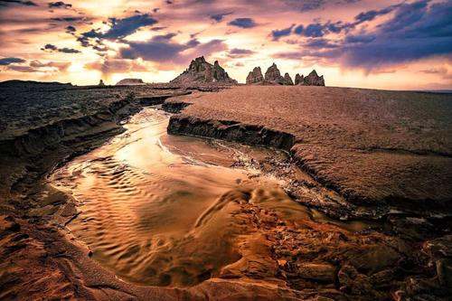 隨后我們來到深居柴達(dá)木盆地腹地的【水上雅丹】。這是世界上唯一一處水上雅丹地貌,因其位置較偏僻,即使是當(dāng)?shù)厝艘部赡懿恢趺催^去,所以至今仍是一片未開發(fā)的處女地,鮮少有人涉足。這立于汪洋之上的雅丹地貌群經(jīng)過上千年的風(fēng)雨殘蝕,如同遨游大海顯露脊背的群鯨,湖岸邊高大的鯨背是天然的觀景臺(tái),極目遠(yuǎn)望,西邊是高低錯(cuò)落的水上雅丹地貌群,有的如策馬揚(yáng)鞭,有的如奔馳的駱駝,有的像婀娜多姿的女子,魔幻而神秘。以清澈透明的藍(lán)天為幕,參差錯(cuò)落的雅丹地貌與碧波交相輝映,天上鴨鳴雁啼,水中波光粼粼,這一望無際的荒漠中憑空而出了一片”汪洋“,只有親身看過這一片汪洋上的鬼斧神工之作,才會(huì)明白為它為什么會(huì)被人稱為“魔鬼城”。