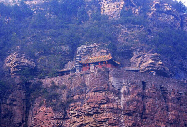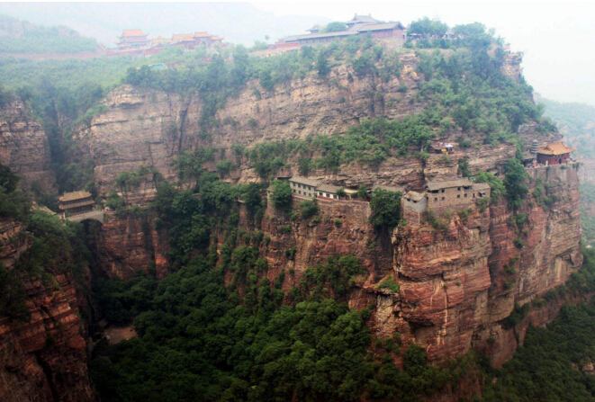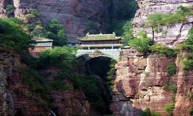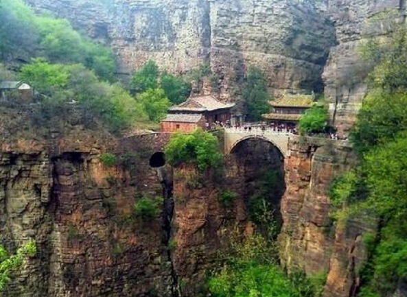 一絕“橋樓殿”。橋凌駕于百仞峭壁之間,仰視藍(lán)天一線,俯首萬丈深淵。形制如同趙州橋敞肩拱式。橋上建樓,云飛樓動,樓內(nèi)建殿,殿內(nèi)三尊大佛。真是“千丈虹橋望入微,天光云彩共樓飛”,不是仙境勝似仙境,疑是天堂落塵?!,F(xiàn)為中國三大懸空寺之一。
