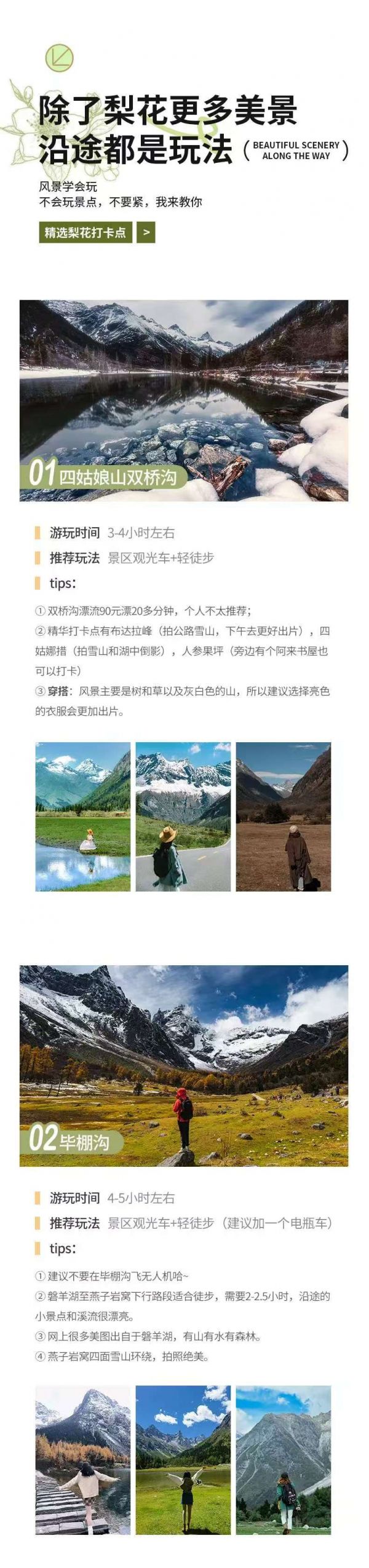 早餐后前往【四姑娘山雙橋溝】換乘觀光車游覽,溝內(nèi)兩面皆是山,卻山山不同,溝內(nèi)處處皆景,而景景有別,真可謂“橫看成嶺側成峰,遠近高低各不同”。在長達40余公里的溝內(nèi),雪山比比皆是,從畫屏口的【鍋莊山】到【攆魚壩】的犀牛望月、企鵝嘴、尖刀山等等,依次排列了十幾座海撥4000多米以上的雪山。一路往里面走,前后左右,雪山盡入眼底,站在溝谷任何一處地方,均可360°無死角欣賞雪山。游覽完雙橋溝吃過午餐前往本次梨花開的最繁茂的地點【神仙包】,經(jīng)過喀爾鄉(xiāng),前往【神仙包】,一路美景不斷,也是觀賞梨花最好的地方??梢园衍囬_到神仙包背后的山腰上,在這里可以目睹神仙包的全貌和大金川河,褐黑的土地,黃色的莊稼和其他顏色共同組成一幅幅非常漂亮的天然圖畫。