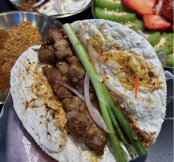 淄博燒烤獨特的“小烤爐+肉卷小餅+蔥+醬”吃法,是其風靡全國的制勝法寶 。每個餐桌都配備一個小火爐,服務員會將七八分熟的烤串送到桌上,接下來就輪到顧客親自上陣。在小火爐上,烤串嗞啦冒油,將肉一把擼下,用巴掌大、烙至起泡的小餅一包,再加上脆嫩的山東嫩蔥,灑上自己調配的辣醬等蘸料,一口下去,麥香、肉香、蔥香與蘸料的香味完美融合,碳水化合物解油解膩,豐富多樣的配料刺激著味蕾,形成了獨特的“淄博Taco”。