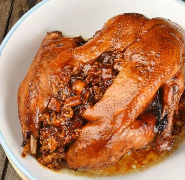先將鴨子處理干凈,去骨后保持鴨皮完整。 把炒好的八寶餡料填入鴨腹中,用線縫合開(kāi)口。然后將填好餡料的鴨子放入鍋中,加入調(diào)料和適量的水,用小火慢燉至鴨肉熟爛,湯汁濃稠。