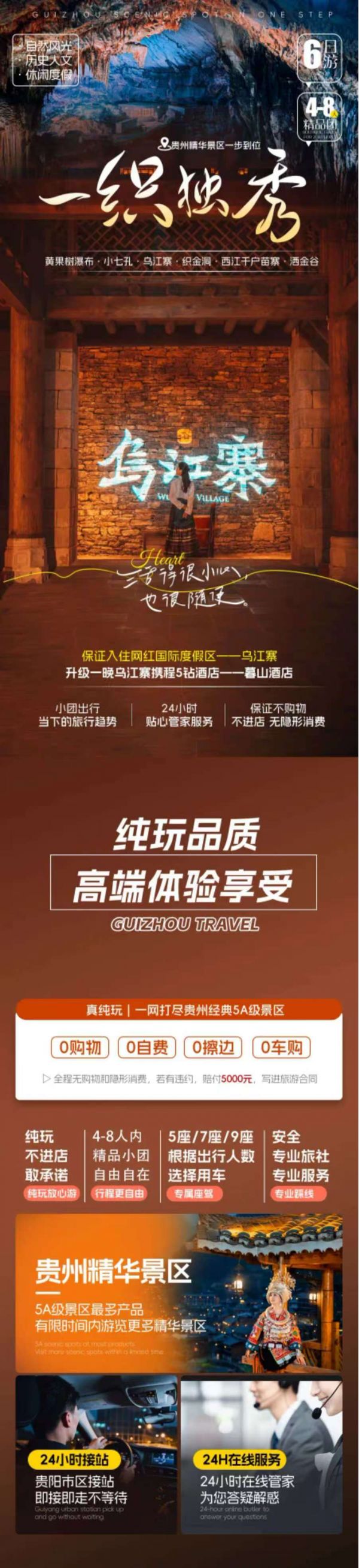 下午:午餐后乘車前往【烏江寨】國際旅游度假區(qū),車程約2.5H(景區(qū)電瓶車已包含,不限次數(shù)乘坐),江南千條水,云貴萬重山,一灣烏江碧水飄落在山間,如黛青山擁簇著烏江寨,兩岸吊腳樓錯落有致,滿滿的黔北風情,宛若治愈力拉滿的世外桃源,青山、綠水、吊腳樓、青磚黛瓦、民居、民俗、水舞秀...描繪出一幅黔北民居群落的壯美畫卷,在太乙閣碼頭坐上一艘搖櫓船,穿行在氤氳水汽之間,鱗次櫛比的吊腳樓撲面而來,斜倚船頭,坐看云煙升騰,晨光下的美景猶如一幅水墨畫在眼前暈染開來。景區(qū)是集觀光、休閑、度假、康養(yǎng)、會展為一體的大型綜合業(yè)態(tài)的旅游目的地。景區(qū)內(nèi)辦理入住酒店后自由游覽,晚上景區(qū)內(nèi)可以欣賞震撼壯觀的水舞秀、燈光秀、獨竹飄,無人機編隊表演等。