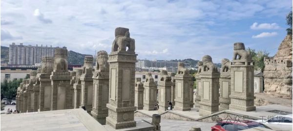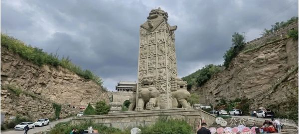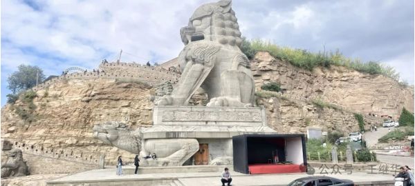 走出紀(jì)念區(qū),我們驅(qū)車10分鐘抵達(dá)石魂廣場。這里是“石雕之鄉(xiāng)”綏德的另一張名片,以兩尊19.5米高的巨型石獅(赑屃馱負(fù))為核心,為中國最大石獅。