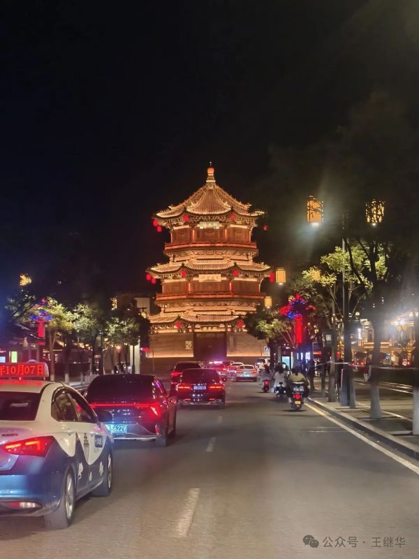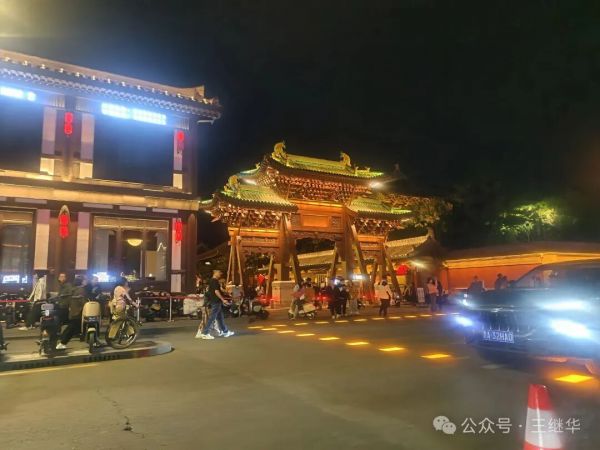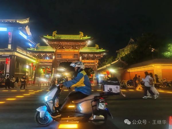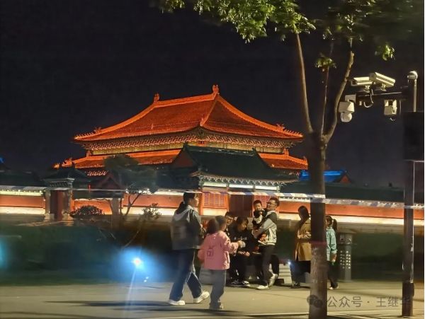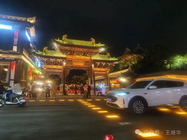 低頭想,若回到千年前的古代,這古城該是另一番景象——沒有如今流光溢彩的LED燈,只有油燈在窗欞間搖曳,光暈微弱卻溫柔,官員的轎子從街上經(jīng)過,燈籠在前面引路,百姓的屋里透出昏黃的光,母親在燈下縫補(bǔ),孩童在屋內(nèi)嬉鬧。那樣的夜晚或許沒有如今熱鬧,卻多了幾分煙火氣的靜謐。