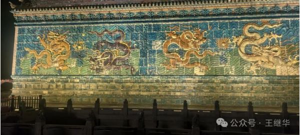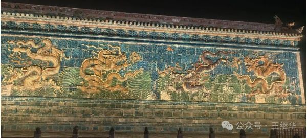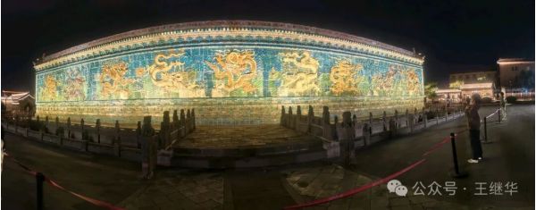 行至九龍壁時,我們特意停下車。白日里或許能看清釉色的細(xì)微紋路,但夜晚的九龍壁,在燈光的映襯下更顯靈動。